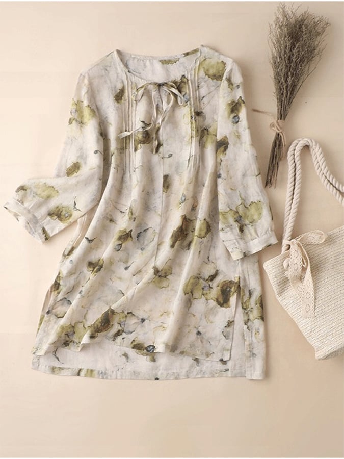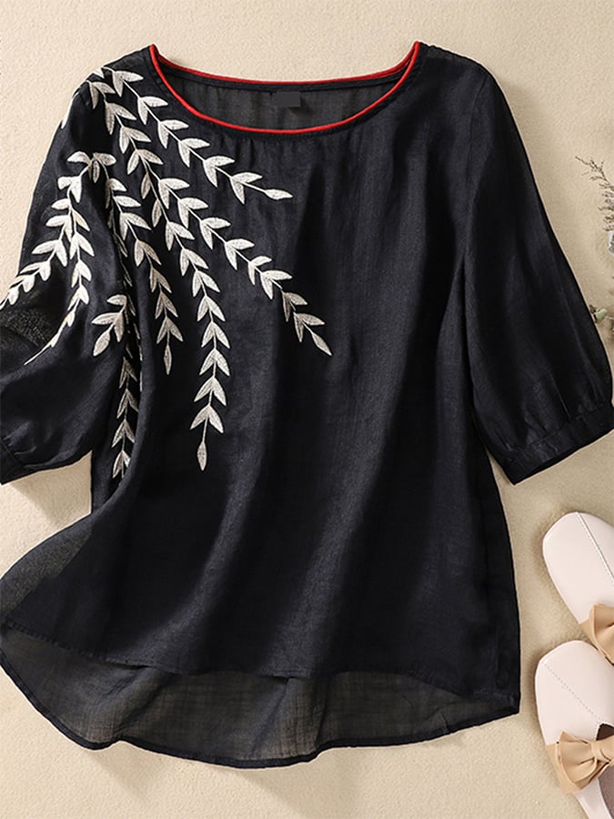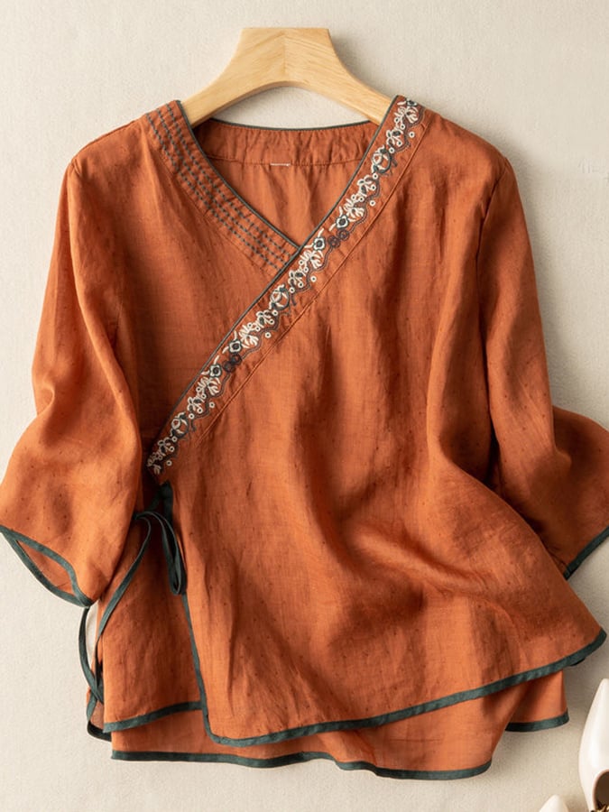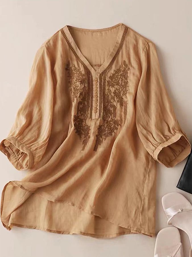 Cotton Linen Fine Embroidery V-neck Casual Top
