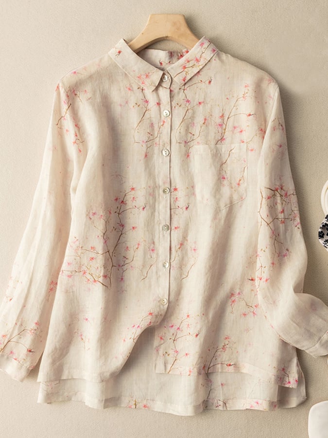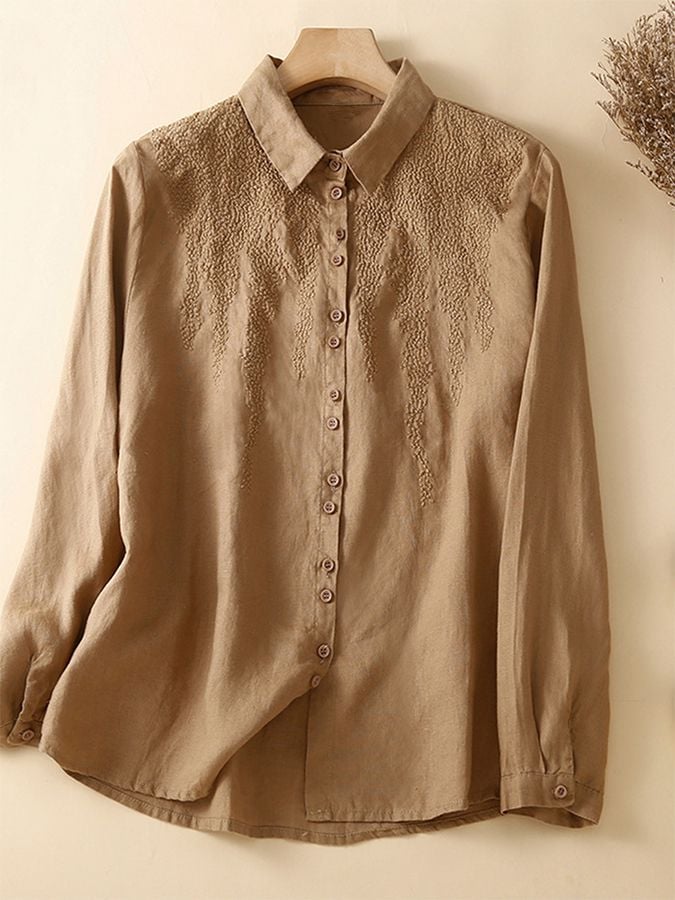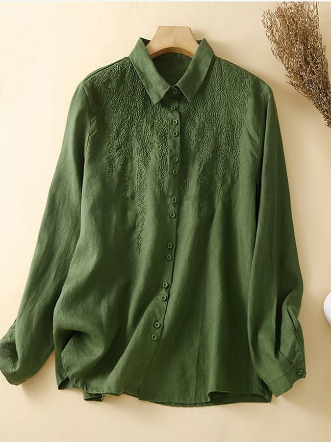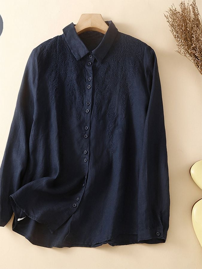 Solid Color Cotton And Linen Embroidery Loose All-Match Shirt